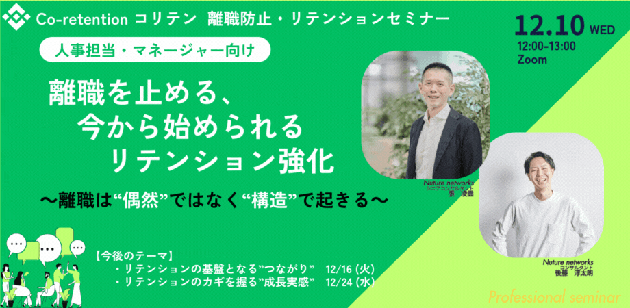【ご案内】2025年12月10日開催 無料セミナー【離職に悩む企業に知ってほしい】【離職防止・リテンションを基礎から学ぶ】離職を止める、今から始められるリテンション強化~離職は“偶然”ではなく“構造”で起きる~